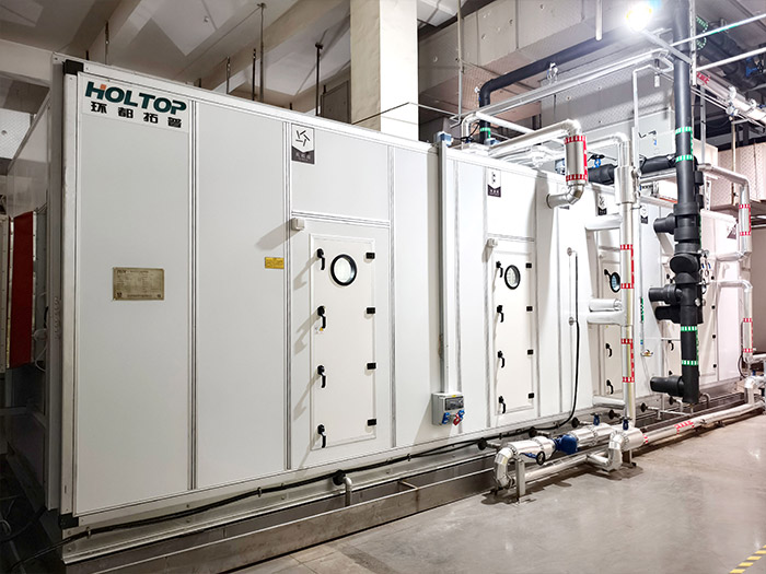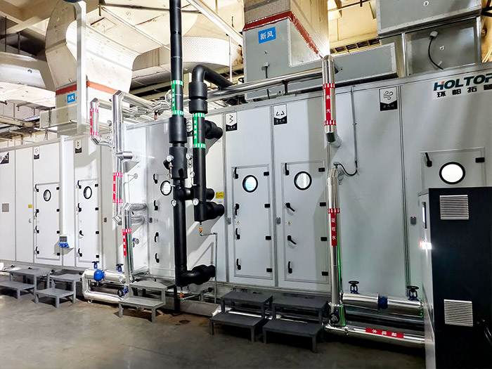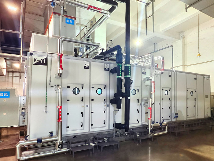 (一)大风量设计:保障大空间温湿度稳定烟草加工车间普遍空间大、设备密集,空气流场复杂,如果风量不足易造成局部温湿度不均,影响烟丝含水率和品质一致性。环都拓普为此配置大风量HJK50U系列组合式空调机组,实现强劲送风与精准分区控制,使储丝房等大空间环境内的温湿度分布更加均匀稳定,通过优化气流组织与风压平衡,设备可在高负荷连续运行下依然保持送风均匀且恒温恒湿,显著提升烟草工艺稳定性与产品均匀性。