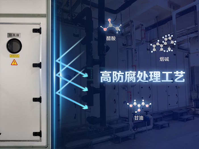 (三)耐腐蚀结构:适应高腐蚀环境考虑到烟草行业生产过程中存在的烟碱、醋酸及甘油等腐蚀性物质,环都拓普对机组进行了系统性防腐设计。机组无论是箱体结构还是内部部件(包括风机、电机、过滤器、换热盘管、挡风板、加湿器、底板及框架等),均选用高防腐材料或高防腐处理工艺,这一设计大幅提升了设备在高湿、高温、含腐蚀性气体环境下的可靠性,确保机组长期运行稳定,为客户有效延长设备使用寿命、降低维护成本。